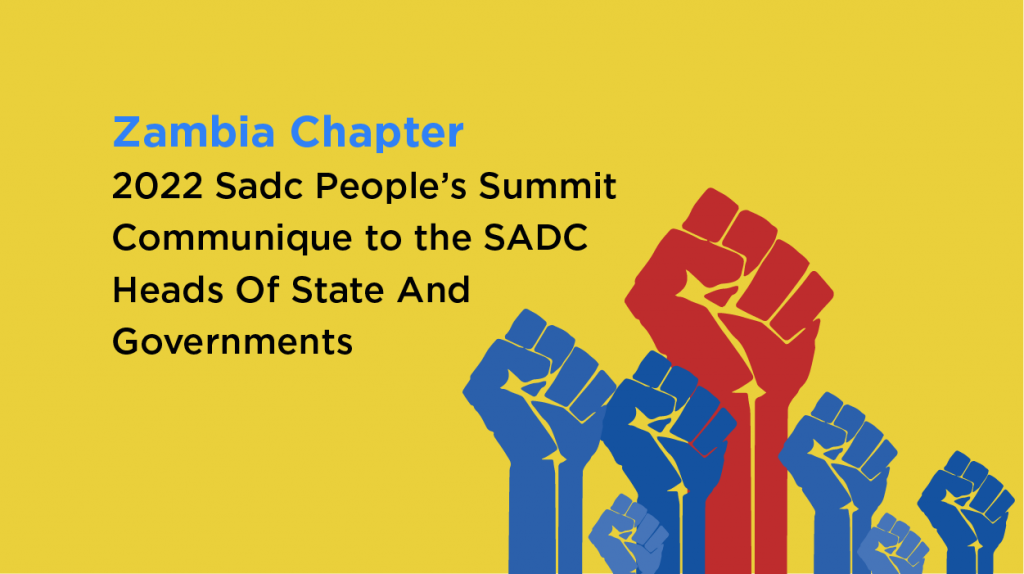 We, the grassroots social movements, Civil Society Organizations (CSOs), smallholder farmer movements, women organizations, youth organizations, children’s rights movements, persons with disabilities/gender/ consumer, and movements representing the various thematic groups which include Governance and Democracy, Agriculture, Energy, Environment, Natural Resources Management, Extractives, Education, Health, Climate Change, Human Rights, Cross Border Trade, Land, Water Sanitation and Hygiene (WASH) convened at St Paul’s United Church of Zambia Conference Community Hall Lusaka District of the Republic of Zambia, on 17th June 2022 and other virtual platforms under the theme: “Reclaiming SADC and taking ownership of our resources for people-centered development”